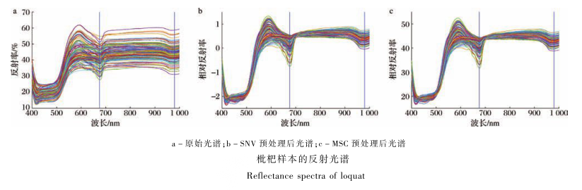 為實(shí)現(xiàn)快速無損檢測水果品質(zhì),對水果進(jìn)行分級,進(jìn)而提升水果的經(jīng)濟(jì)價(jià)值,本文以開陽富硒枇杷為研究對象,提出了一種基于可見/近紅外光譜結(jié)合化學(xué)計(jì)量學(xué)預(yù)測枇杷糖度的方法。首先,采用光纖光譜儀獲取枇杷樣本的光譜數(shù)據(jù),并測定枇杷的實(shí)際糖度值。然后,提取樣品的光譜數(shù)據(jù),采用SNV和MSC 2種方法對其進(jìn)行預(yù)處理,并基于原始光譜和經(jīng)預(yù)處理后的光譜建立預(yù)測枇杷糖度的PCR和PLSR模型。