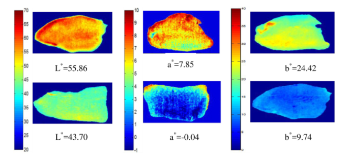 應用可見/短波近紅外(400-1000nm)高光譜成像技術對不同冷藏天數的雞胸脯肉的顏色(L*,a*,b*)和嫩度值進行快速無損檢測。首先通過采集雞肉的高光譜圖像并提取平均光譜,然后用校正集樣本的光譜與顏色(L*,a*,b*)、嫩度WBSF參考值建立PLSR 回歸模型。再次,對比應用RC 和 SPA提取L*,a*,b*和嫩度的特征波長,并基干特征波長建立RCPLSR和SPA-PLSR 回歸模型,其中SPA-PLSR模型取得了較高的預測精度,L*,a*,b*和嫩度預測集的R分別為0.876,0.897,0.959和0.740,RMSEP分別為1.518,0.882,1.175 和11.147。最后,用SPA-PLSR模型對預測集樣本圖像上每個像素點的L*,a*,b*數值進行預測,并結合圖像處理算法,以偽彩圖的形式實現了L*,a*,b*數值的可視化,為將來的高光譜成像技術在雞肉加工領域的自動化、精細化應用奠定了基礎。