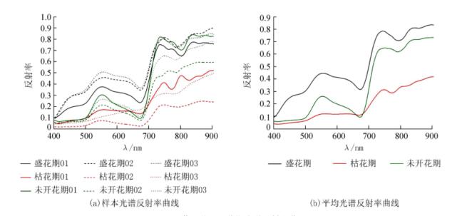 ①盛花期和未開花期光譜反射率存在明顯"綠峰(510~560 nm)”和“紅谷(640~700 nm)”,而枯花期“綠峰”和“紅谷”逐漸消失,整體值大小依次為盛花期、未開花期、枯花期;