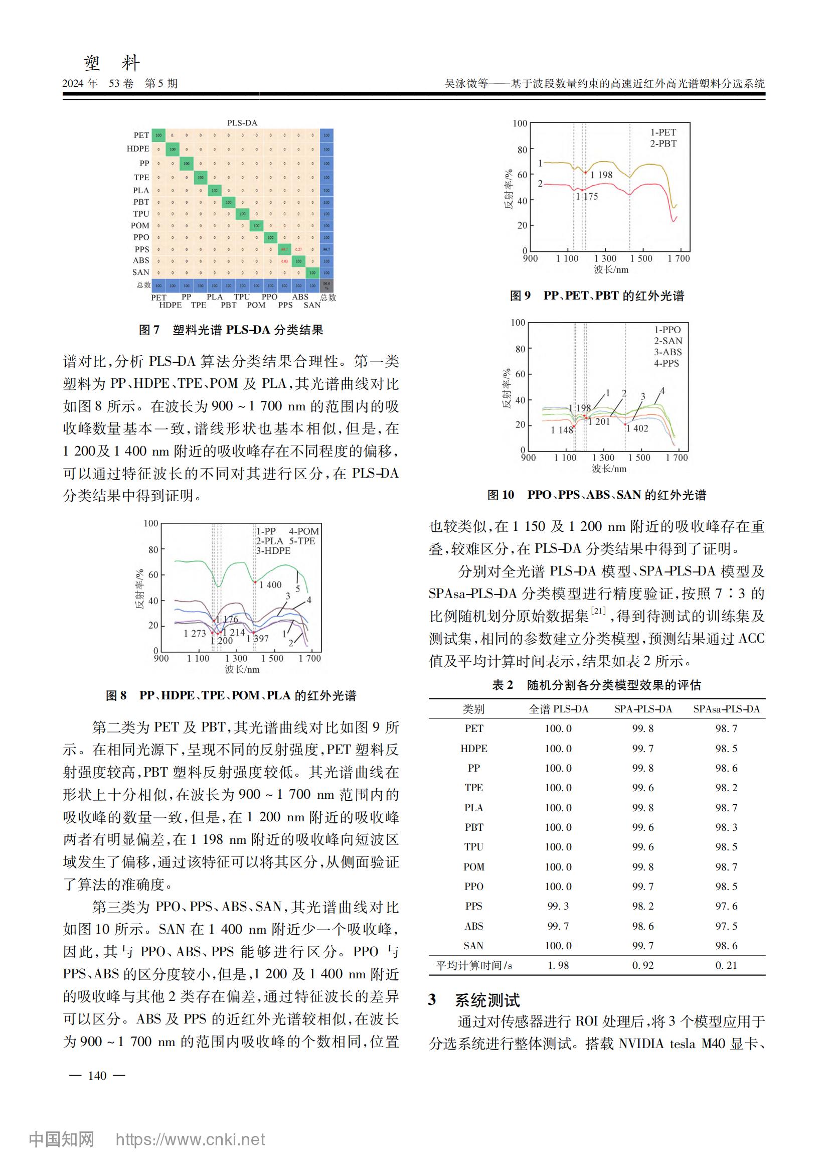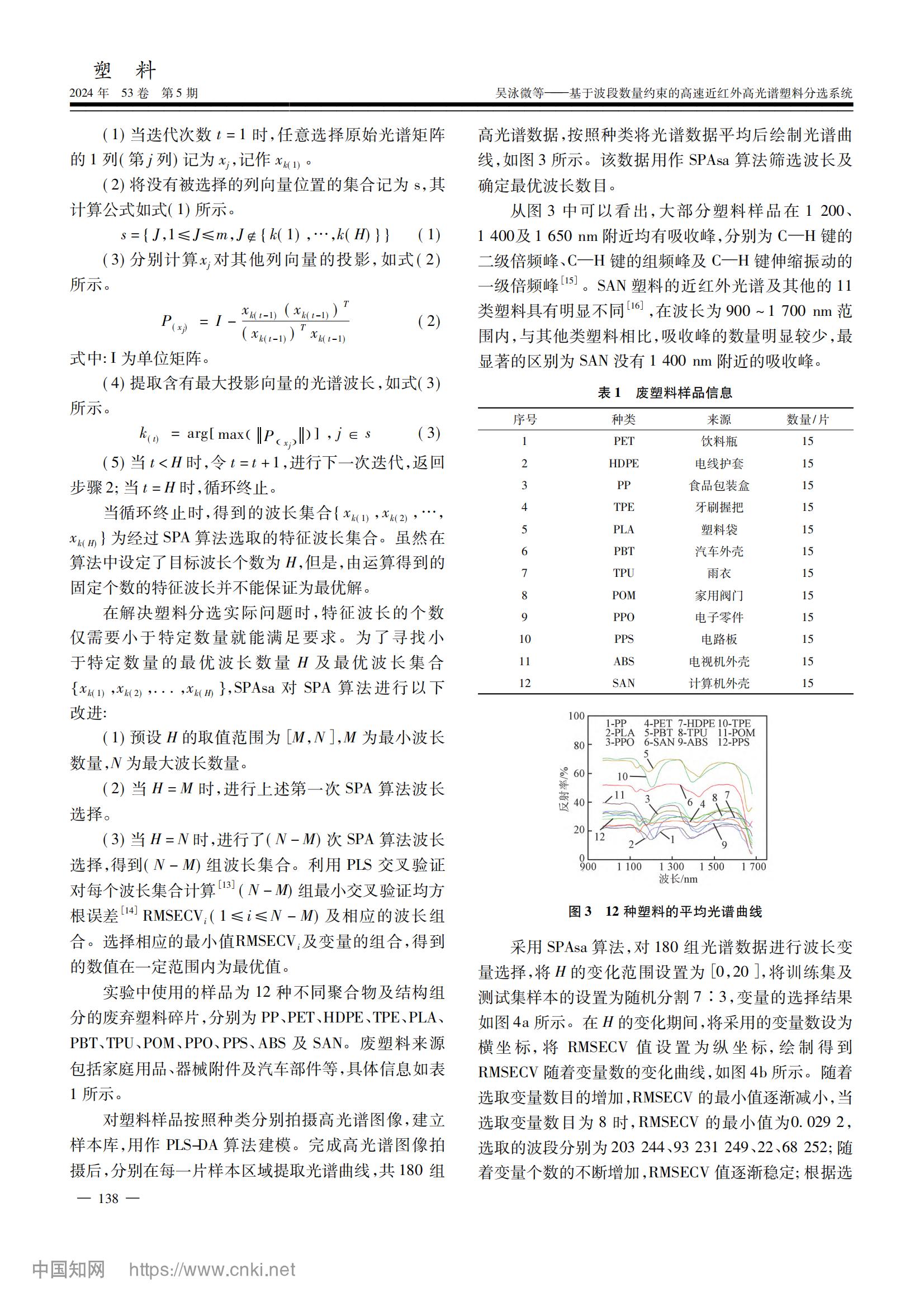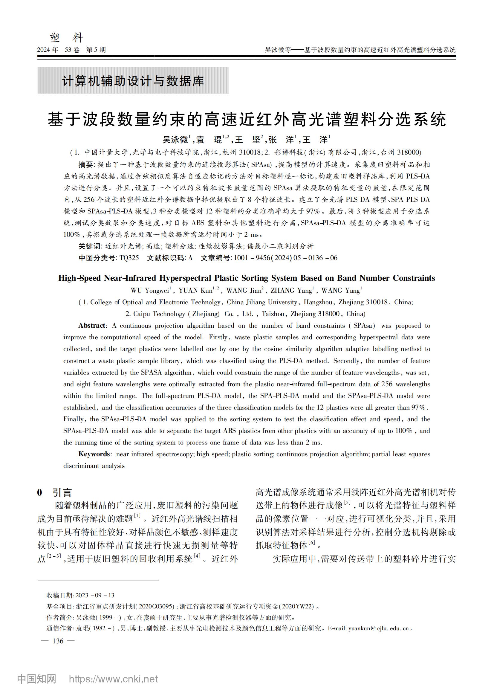 本論文提出了一種基于波段數量約束的連續投影算法(SPAsa),提高模型的計算速度。采集廢舊塑料樣品和相應的高光譜數據,通過余弦相似度算法自適應標記的方法對目標塑料逐一標記,構建廢舊塑料樣品庫,利用PLS-DA方法進行分類。并且,設置了一個可以約束特征波長數量范圍的SPAsa算法提取的特征變量的數量,在限定范圍內,從256個波長的塑料近紅外全譜數據中擇優提取出了8個特征波長。建立了全光譜PLS-DA模型、SPA-PLS-DA模型和SPAsa-PLS-DA模型,3種分類模型對12種塑料的分類準確率均大于97%。最后,將3種模型應用于分選系統,測試分類效果和分類速度,對目標 ABS 塑料和其他塑料進行分離,SPAsa-PLS-DA 模型的分離準確率可達100%,其搭載分選系統處理一幀數據所需運行時間小于2ms。