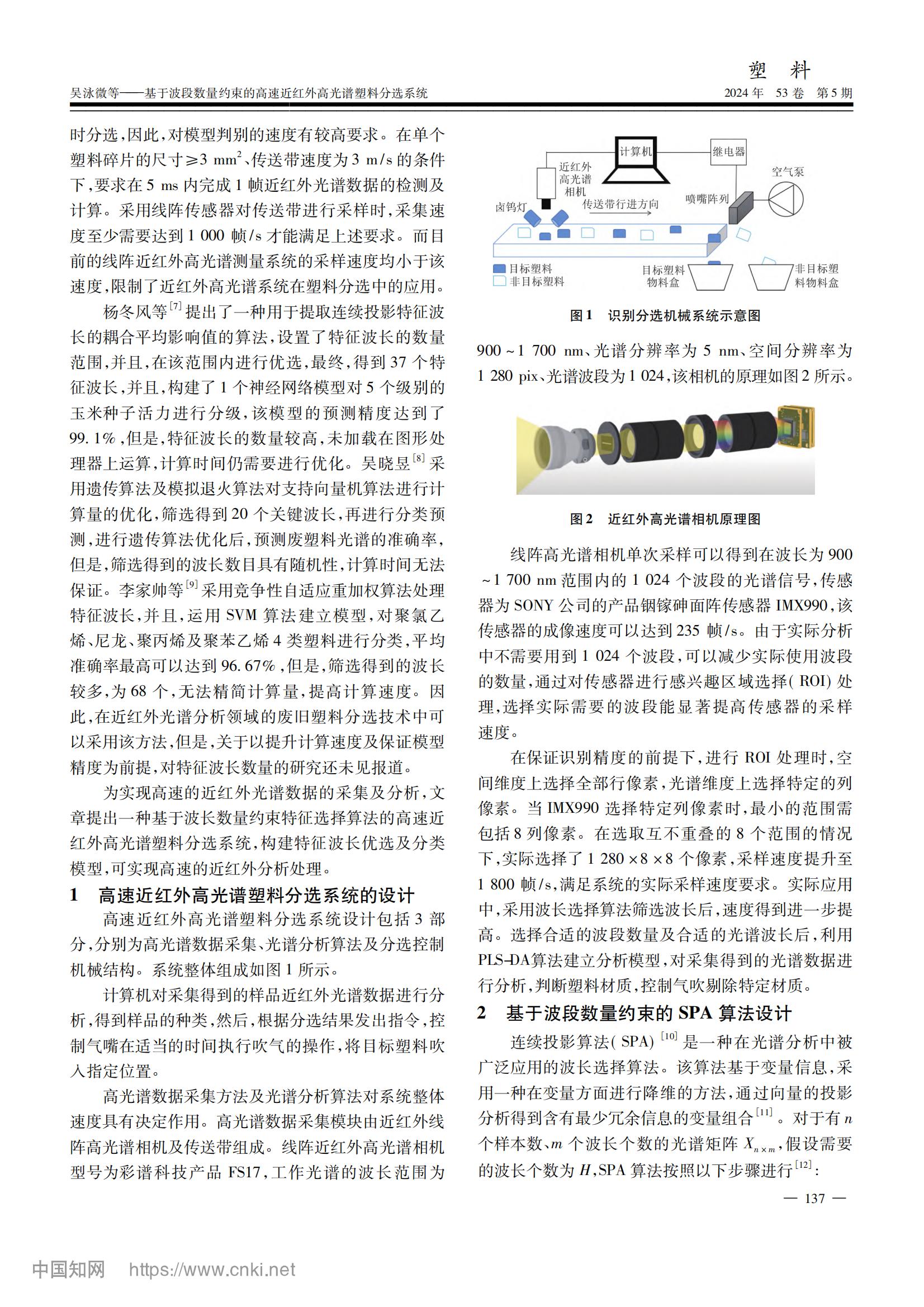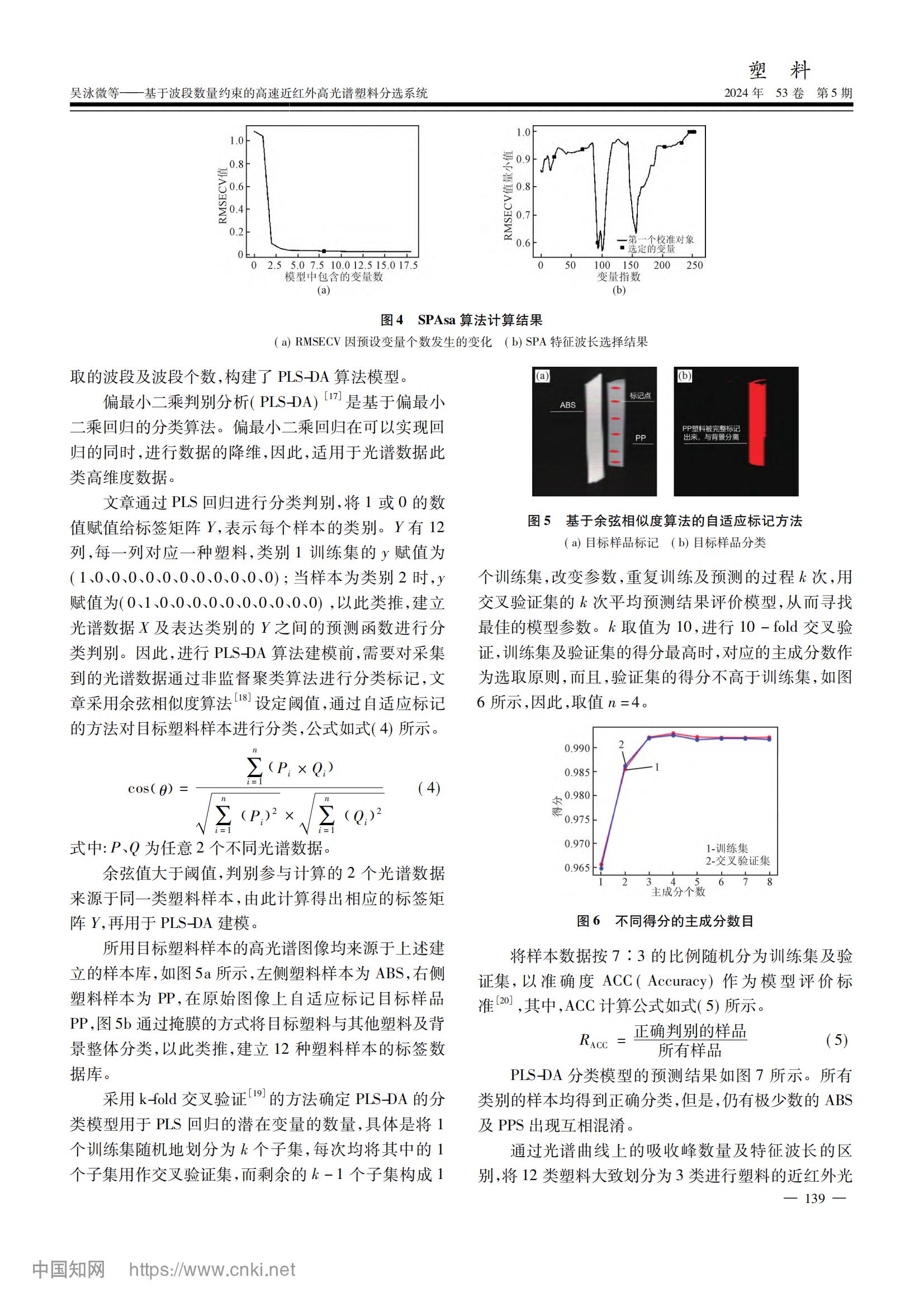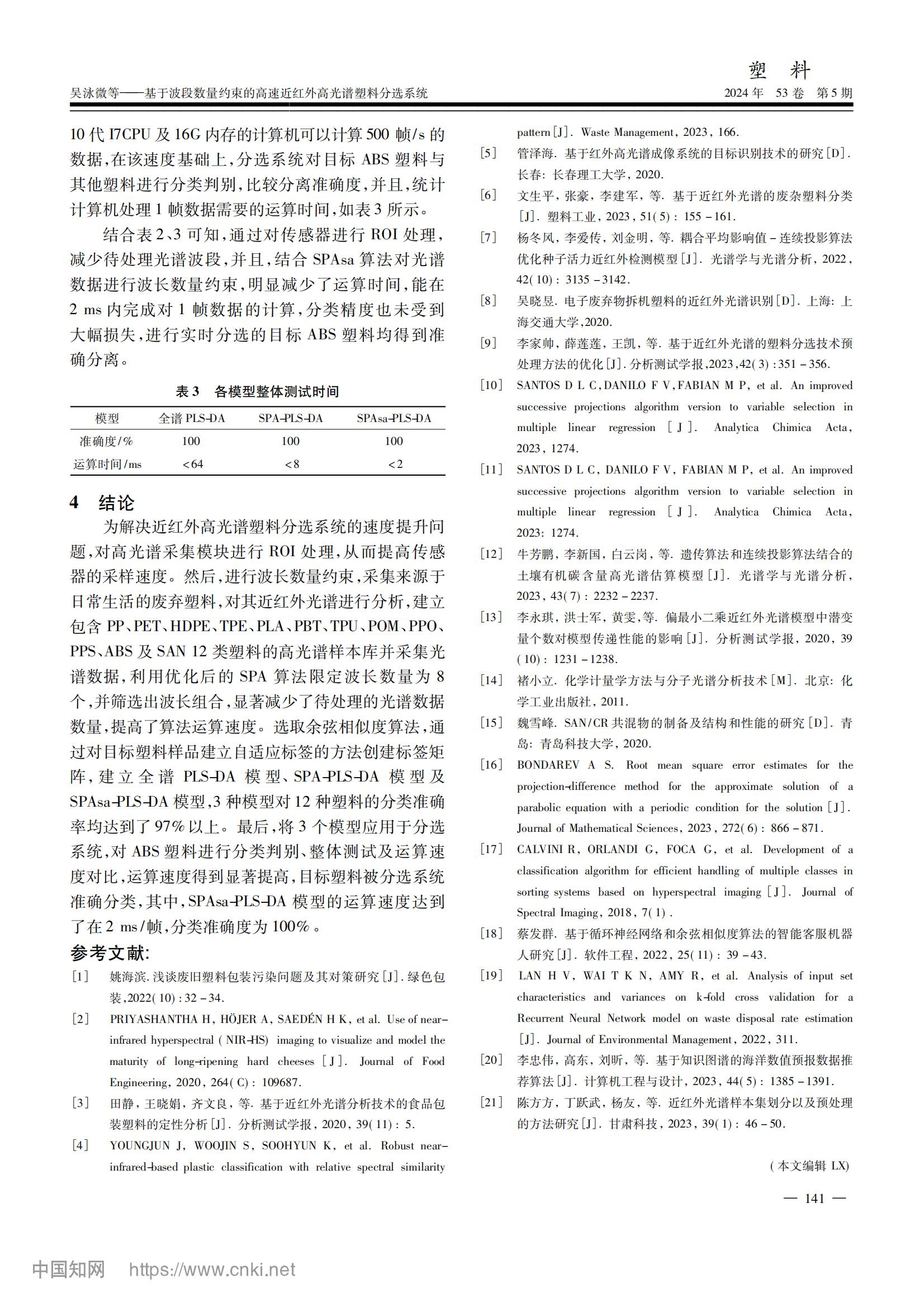 本論文提出了一種基于波段數量約束的連續投影算法(SPAsa),提高模型的計算速度。采集廢舊塑料樣品和相應的高光譜數據,通過余弦相似度算法自適應標記的方法對目標塑料逐一標記,構建廢舊塑料樣品庫,利用PLS-DA方法進行分類。并且,設置了一個可以約束特征波長數量范圍的SPAsa算法提取的特征變量的數量,在限定范圍內,從256個波長的塑料近紅外全譜數據中擇優提取出了8個特征波長。建立了全光譜PLS-DA模型、SPA-PLS-DA模型和SPAsa-PLS-DA模型,3種分類模型對12種塑料的分類準確率均大于97%。最后,將3種模型應用于分選系統,測試分類效果和分類速度,對目標 ABS 塑料和其他塑料進行分離,SPAsa-PLS-DA 模型的分離準確率可達100%,其搭載分選系統處理一幀數據所需運行時間小于2ms。